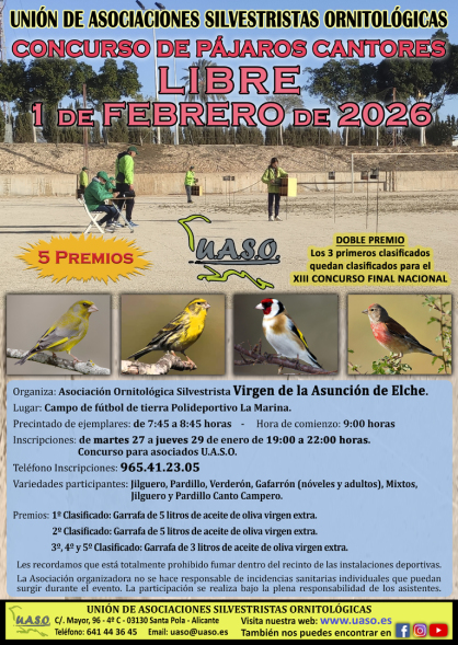 El próximo domingo día 1 de febrero de 2026 la Asociación Ornitológica Silvestrista Virgen de la Asunción de Elche organizará en el campo de fútbol del polideportivo La Marina (calle Correos, 22), el último concurso libre de la temporada y de preparación antes de dar comienzo el Campeonato de la Regularidad U.A.S.O.