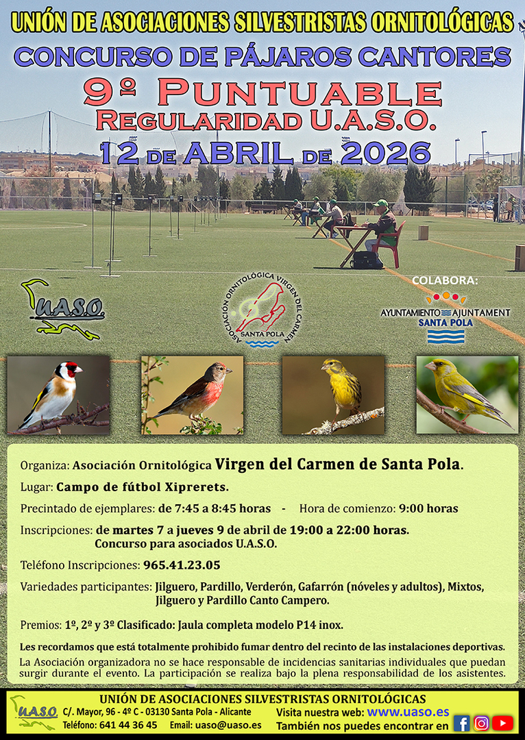 El próximo domingo 12 de abril de 2026, la Asociación Ornitológica Virgen del Carmen de Santa Pola organizará la última prueba puntuable del Campeonato de la Regularidad U.A.S.O., en el campo de fútbol Els Xiprerets (Polideportivo Els Xiprerets).